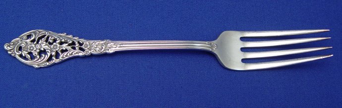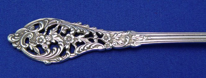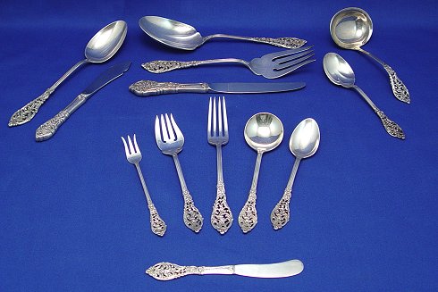 REED & BARTON STERLING FLATWARE IN THE PIERCED ''FLORENTINE LACE'' PATTERN: 103 piece complete service for 12 to include 12 each of dinner knives (9''l), dinner forks (7 1/4''), salad forks, butter knives, cocktail forks, soup spoons, and 24 teaspoons, 2 serving spoons, casserole spoon, meat fork, gravy ladle, meat fork, master butter and sugar shell. No monograms. Sold in the wooden box.