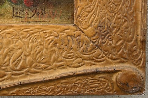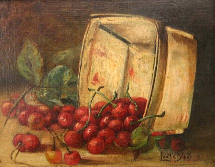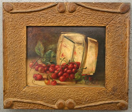 YOST, Leota, (American, 19 C): Still life of cherries in a basket, O/C Panel, 8 1/4'' x 10 3/4'', encased in an embossed gessoed period frame with some wear, 13 1/2'' x 15 3/4''.