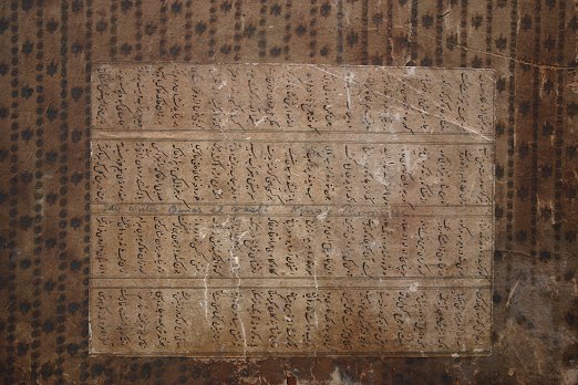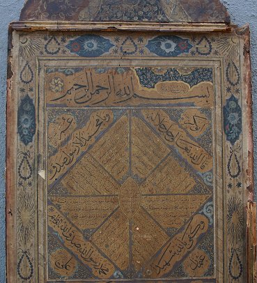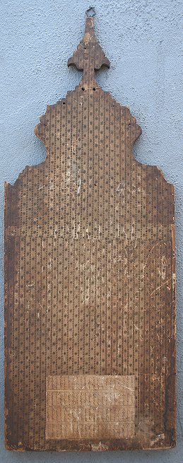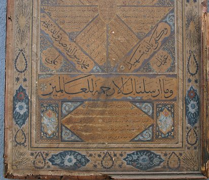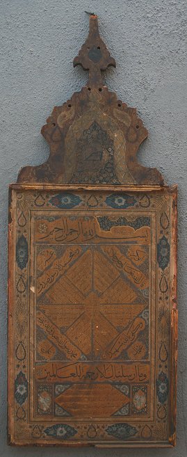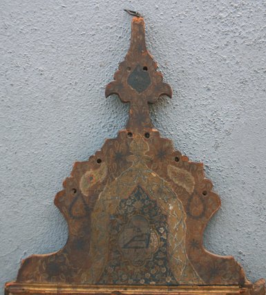 19TH CENTURY INDIAN PAINTING ON PAPER LAID ON BOARD: Possibly a religious scripture with floral borders and elaborate gold designs throughout, scripture written both front and back, affixed to a carved wooden board, major damage and wear to the board, some paper loss, staining throughout. Sold ''as is''.