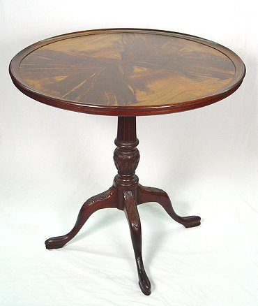 EARLY 20TH C. FLAME GRAIN MAOGANY TEA TABLE: Richly grained round top, 31'' dia., 30''h. Carved pedestal, 4 cabriole legs. Est. $250/400**