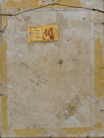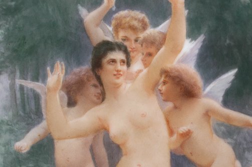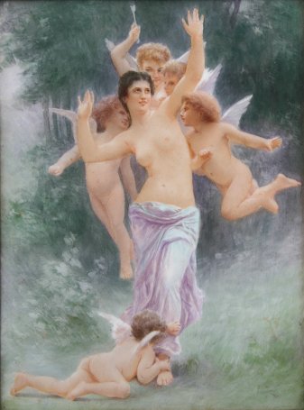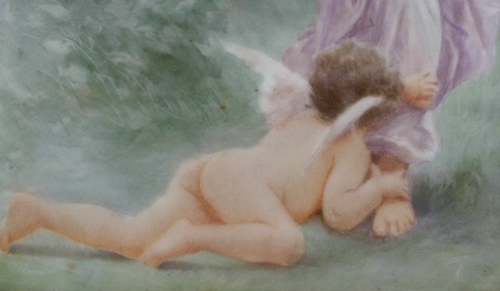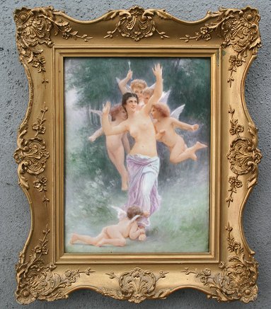 LIMOGES PAINTING ON PORCELAIN PLAQUE DEPICTING A NUDE WITH ANGELS: 11 1/4'' x 8 1/4'', no visible signature, stamped TNV Limoge, affixed labels from the CB Charles Galleries, also the Christine Dodge Cromwell Collection, encased in overpainted gilt frame with some wear and repair, 15 1/2'' x 13''.