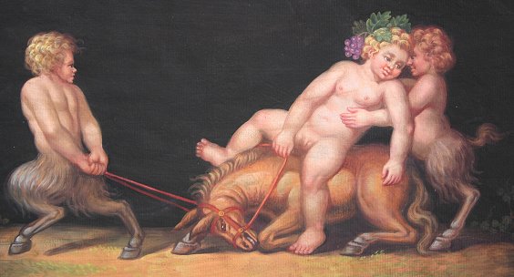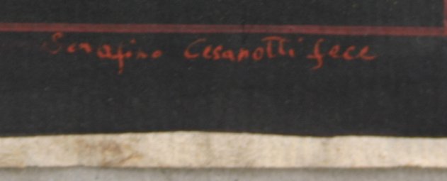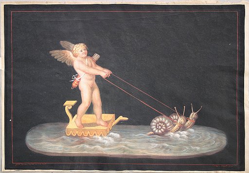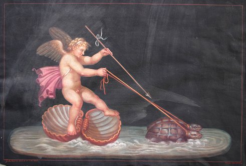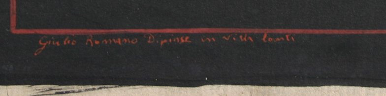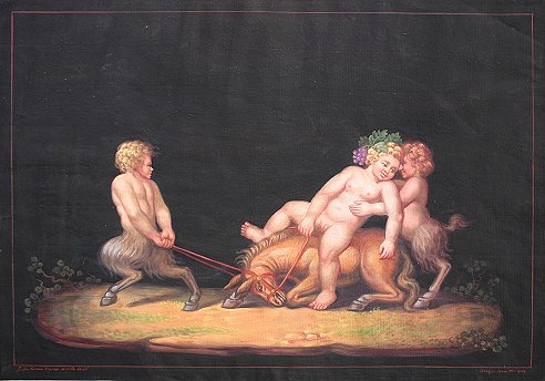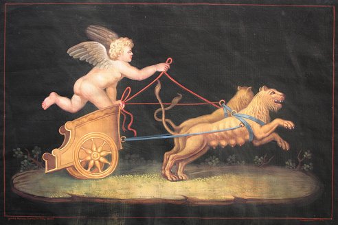 CESAROTTI, Serafino, (Italian, 19th C) SET OF 4 STUDIES OF ANGELS AFTER GIULIO ROMANO: W/C, they all measure approximately 10'' x 15'', signed lower right, all are marked lower left ''Giulio Romano Dipinse in the Villa Lanti(?), all pieces are unframed, in good to very good condition. Please call for detailed condition report. Each scene depicts an angel in a different pose. 1) Angel being pulled in chariot by two lions; 2) Angel being pulled on an oyster shell by two turtles; 3) Two baby satyrs with an amour riding a donkey; 4) Angel being pulled through the water by two snails. Sold as a set. Est. $8000/12000**