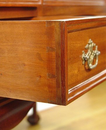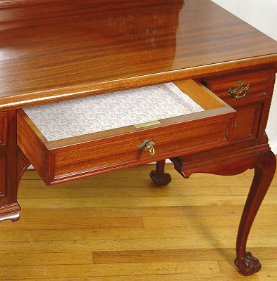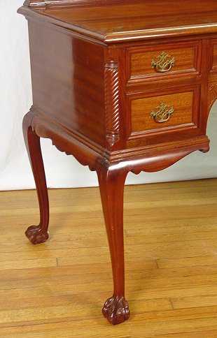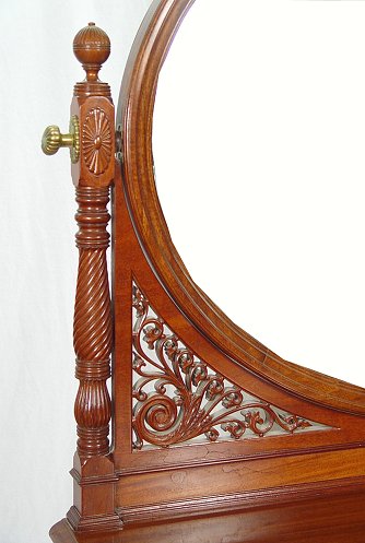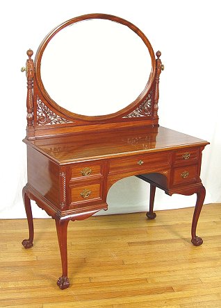 ENGLISH MAHOGANY EDWARDIAN DRESSING TABLE: Featuring an oval mirror that hangs between spiral carved arms. There are pierced carved panels framing the lower portion of the mirror. Knee hole drawers with center drawer locking (key included), spiral carved stiles. Cabriole legs ending in ball and claw feet. Approx. 60'' x 42'' x 22''.