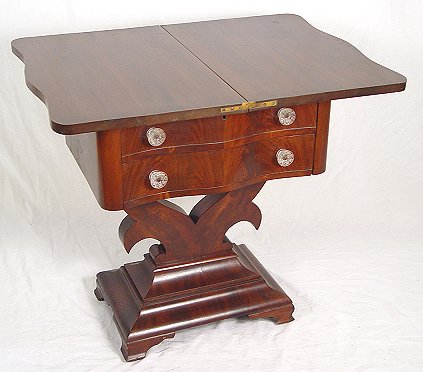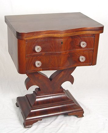 EARLY 20TH C FLAME GRAIN MAHOGANY WORK STAND: Two drawer with glass pulls. The edges of the flip top follow the lines of the Serpentine front drawers. Single split pedestal on a tiered base. 29 1/2''h. x 23'' x 16'' (opens to 16'' x 23'').