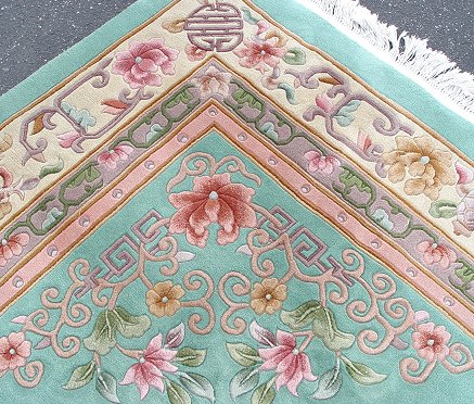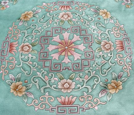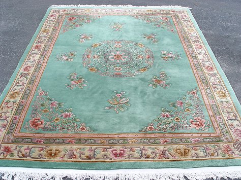 CHINESE SCULPTED WOOL CARPET: Soothing green ground with pastels Approx. 9' x 12'4'', Tientsin.