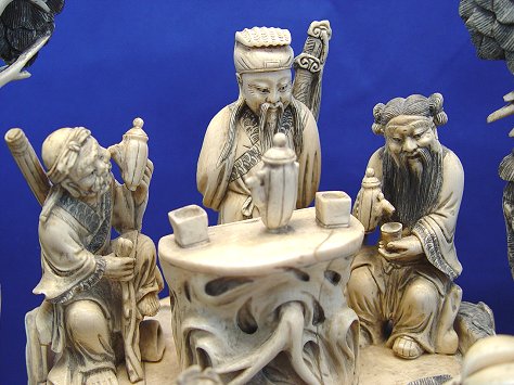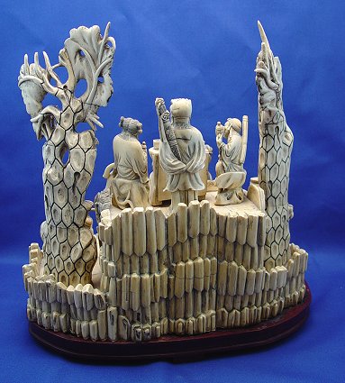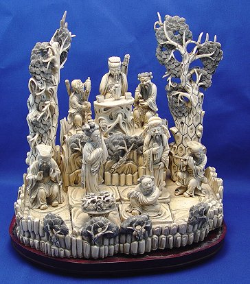 GRANDIOSE CARVED IVORY FIGURE GROUPING: Carved and assembled into an impressive eight figure grouping. Signed in characters on the underside. Includes a custom wood base. 14 3/4''h x 13 1/2'' x 8 1/2'' overall.