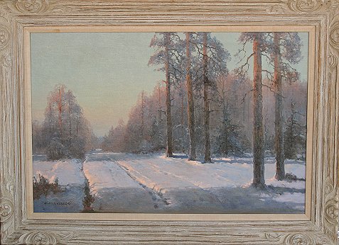 KORECKI, Wiktor, (Polish, 1890-1980): Winter landscape, O/C, 24'' x 36'', signed lower left, carved whitewash frame with wear, 33'' x 44''x 33''. Est. $2000/4000**