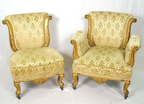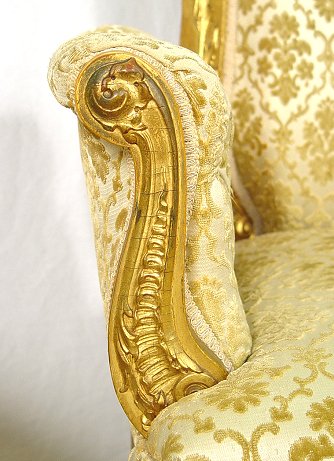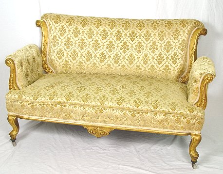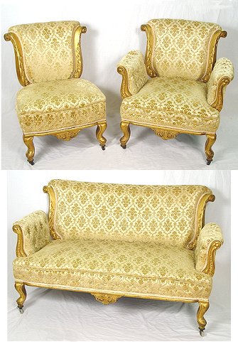 19TH C 3 PC GOLD GILT PARLOR SUITE: Lovely scrolling design with gold gilt to the wood trim, matching gold brocade upholstery. Settee 55''w., side chair 23''w., arm chair 31''w., all pieces 31''h.
