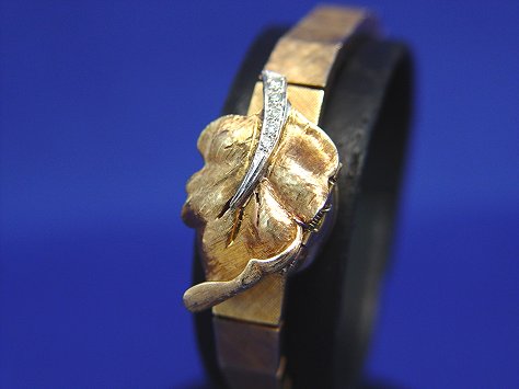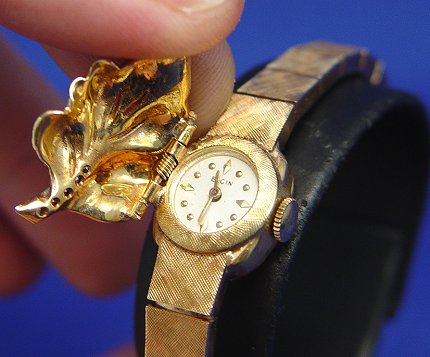 LADY'S ELGIN 14K COVERED WRIST WATCH: Lovely deep yellow brushed gold dress watch with diamond veined leaf hinged cover, Elgin watch and works, marked 17 jewel 902 Adj'd. Case serial #2782095 Attached bracelet with safety chain, approx. 6''l.