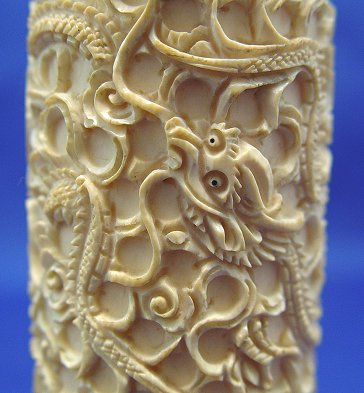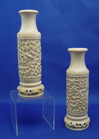 PAIR OF CARVED IVORY DRAGON VASES: Carved from tusks. Each with relief carvings of three intertwined dragons. Pierced carved dragon at the base. 7''h.