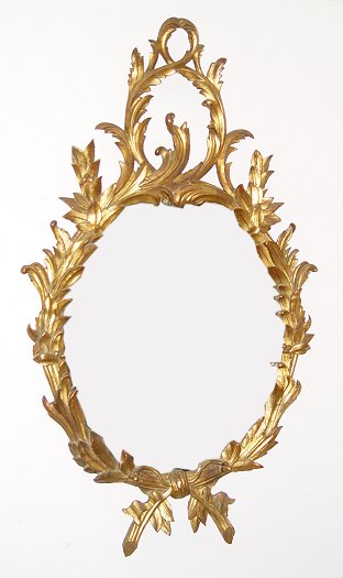 19TH C ITALIAN CARVED GILT MIRROR: Oval shape in carved olive leaf wreath framed. Approx. 47'' X 28'' overall.