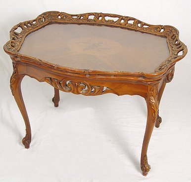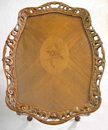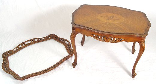 1920'S FRENCH STYLE TRAY TOP TEA TABLE: Marquetry inlay under the removable glass tray top. Pierced carved frame. 27 1/2''h. x 29'' x 22''.