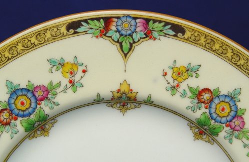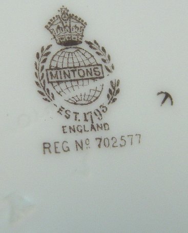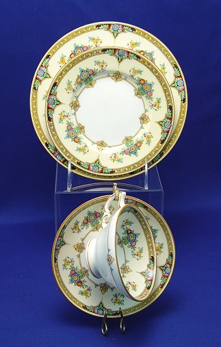 MINTON ''ELOISE'' CHINA DESSERT SET: To include, 15 plates 7 5/8'', 4 plates 6 1/4'', 6 cups and 14 saucers 5 5/8''. Two different marks but same Registry number 702577, slight variation in the shade of yellow on wide band. Coming along for the ride, are some pieces in as is condition.