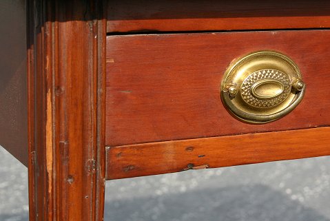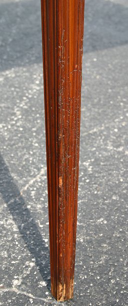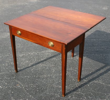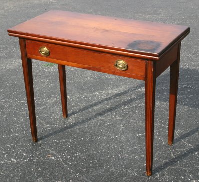 FEDERAL PERIOD CARD TABLE: Swing leg, flip top table with single drawer. Tapered and reeded legs, dovetail and peg construction. Dark blemish to the top. 28''h. x 16 1/2'' x 33''. With leaf extended the table opens to 34''