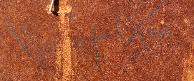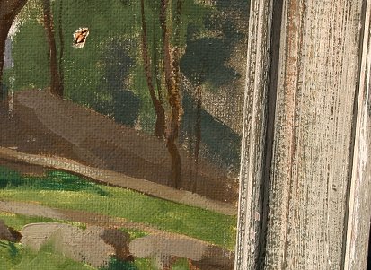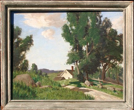 BRUESTLE, Bertram George, (American, 1906-1968): New England landscape with home, O/Masonite, 25'' x 30'', signed lower left, faintly titled verso in pencil ? Home, encased in an original gessoed antiqued molding with wear, 28 1/2'' x 34 1/2''. Condition - Puncture in lower right corner 1/4'' in diameter. Est. $1500/2500**