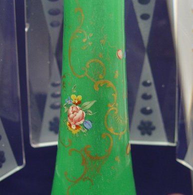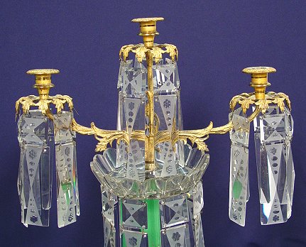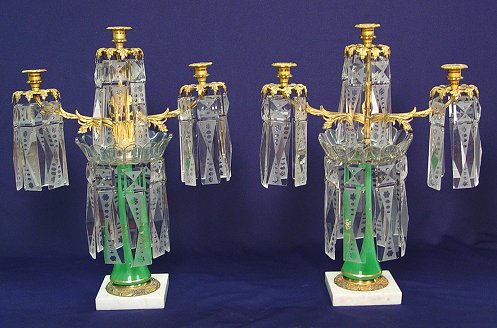 UNUSUAL PAIR OF GILT METAL AND CRYSTAL CANDELABRA: 3 light candle holders with the most unusual prisms. Enameled jade green glass stem, Baccarat quality bobeches, and 1 1/2'' wide cut glass prisms. 23''h., x 17''w.