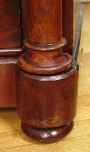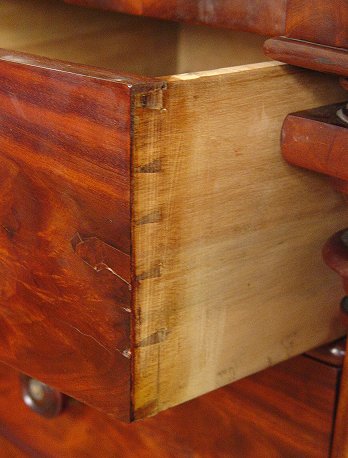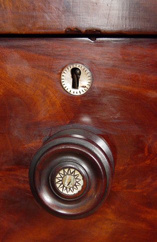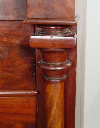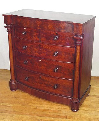 19TH C SCOTTISH FLAME GRAIN MAHOGANY CHEST: A handsome two over three drawers, bowed front chest with mother of pearl inserts on the drawers pulls and escutcheons. Columnar stiles. Approx. 50''h. x 49'' x 22''. Est. $1400/1600**