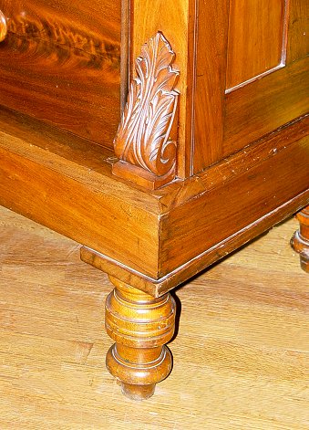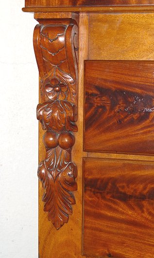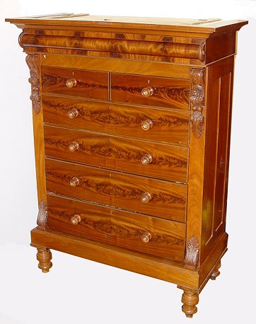 SUBSTANTIAL SCOTTISH MAHOGANY TALL CHEST OF DRAWERS ON STAND: Two over four drawers, with a secret compartment at the top. Three parts- cornice, drawer section, and stand. Carved stiles. Approx. 70''h. x 24 1/2'' x 49''. Est. $1500/1800**