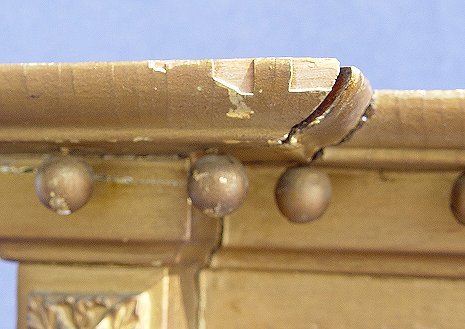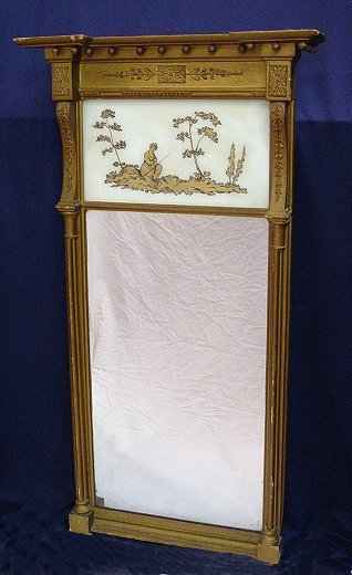 EARLY GILTWOOD AND EGLOMISE MIRROR: 2 part wall mirror with eglomise (gilt glass) scenic panel. Gold ball along the straight cornice. 47'' x 25 1/2'' overall. The looking glass is 29 1/2'' x 16 1/2''. Slightly worn condition, missing top left crest side.