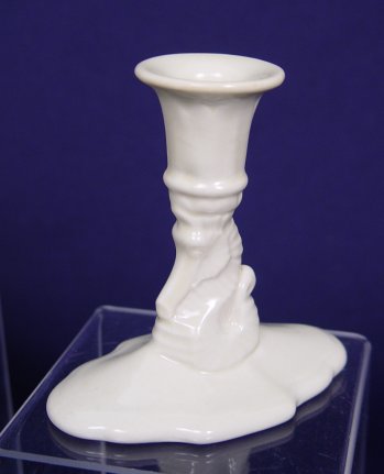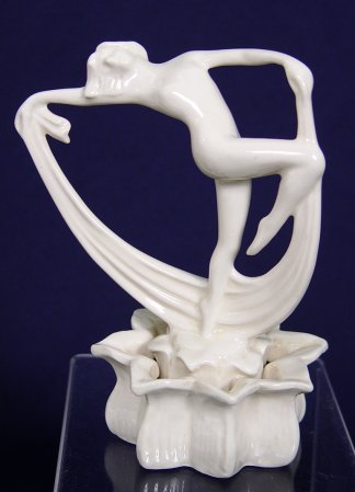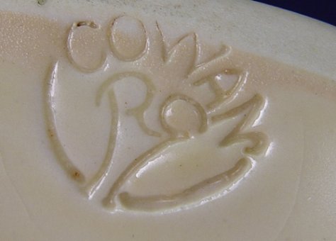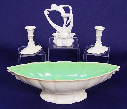 COWAN POTTERY CONSOLE SET WITH NUDE FLOWER FROG: Oblong center bowl with matching seahorse figural candle holders. The dancing nude frog appears to be rising from a lotus. All pieces are impressed with the Cowan backstamp. The bowl is 4 1/2''h. x 16 1/4''l. The candles are 4 1/4''h. and the frog is 7''h. No chips or cracks.
