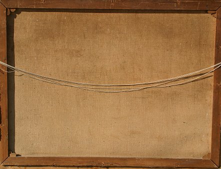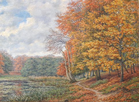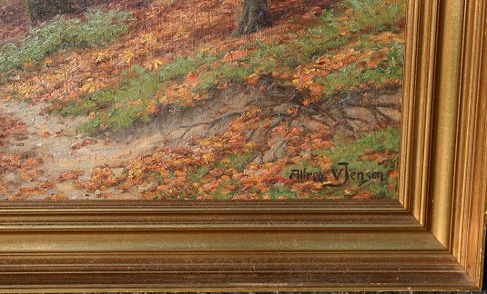 JENSEN, Alfred V. (Danish, 19th/20th C): Autumnal forest clearing with footpath by a pond, O/C, 38 1/2'' x 51 1/2'', signed lower right, encased in moderately worn gold frame, 44 1/2'' x 67 1/2''. Est. $1500/2500**