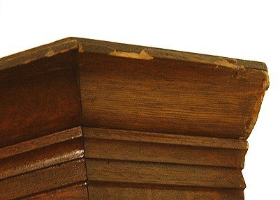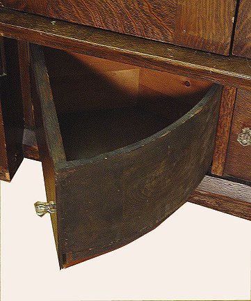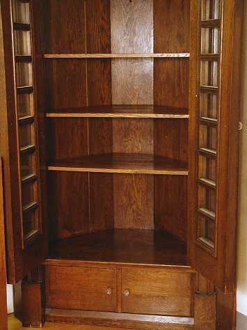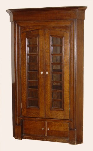 MISSION ERA OAK CORNER CABINET: Hard to find in oak and this one is very substantial corner cabinet. Shelved interior with individually paned doors. The thickness of wood on the doors is 1 3/4''. Two drawers across the base. Glass pulls on the drawer and doors. 87''h. x approx. 53'' wide. 22'' depth. 41'' crest measurement against the wall.