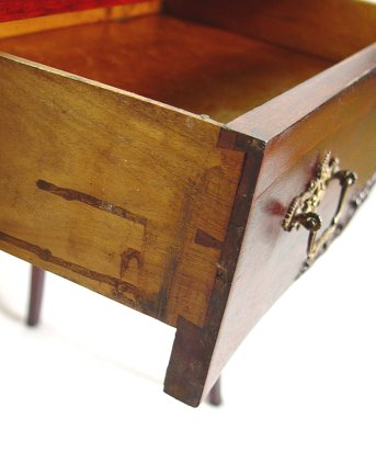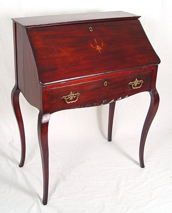 QUEEN ANNE STYLE MAHOGANY SLANT FRONT LADIES DESK: Mother of Pearl and wood inlay decorate the slant front. Interior of pigeon holes and small drawers. Full length single drawer, Queen Anne legs. Refinished condition. 38''h. x 29'' x16 1/2''.