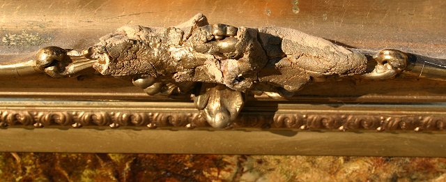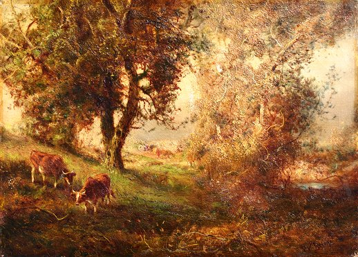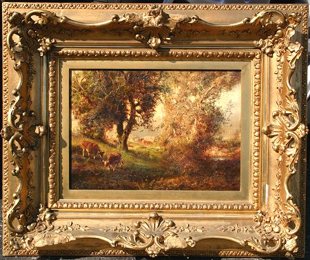 BERRY, Patrick Vincent, (American, 1852-1922): Landscape with cattle grazing near stream, O/C, 10'' x 14'', signed lower right, encased in a period 19th century pierce carved gilt molding with floral and foliate acanthus leaf motif frame, will need some restoration, 20'' x 24''. Condition - Will need cleaning, several spots of paint loss, minor craquelure.
