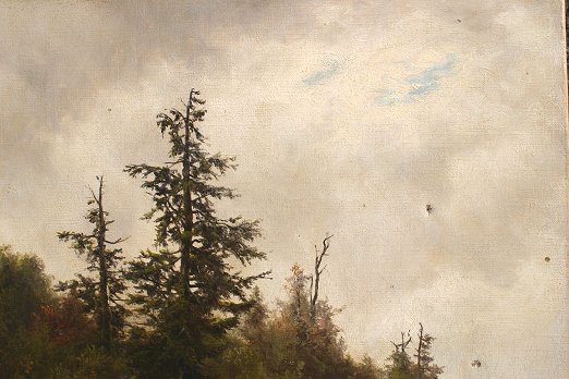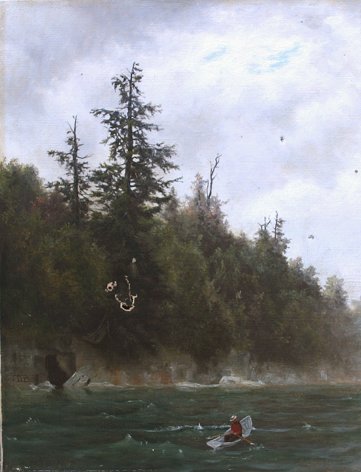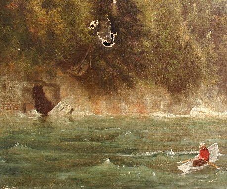 19th C. WHITE MOUNTAIN/HUDSON RIVER SCHOOL O/C: Depicts man rowing a boat, set against a shoreline with standing pines and looming squall, possibly John Dobson Barrow, 18'' x 14'', monogrammed JDB, and dated '74? Condition: Several small punctures in right margin, small 3/4'' tear in left margin and larger puncture in the lower left quadrant which will require a patch and in-paint, needs cleaning, unframed.