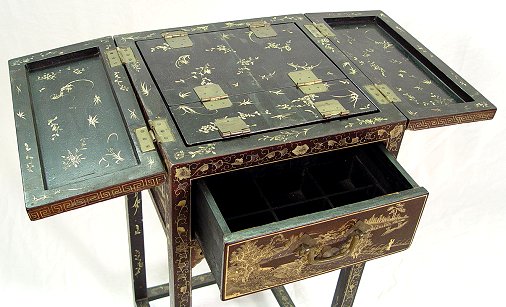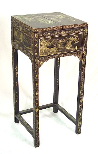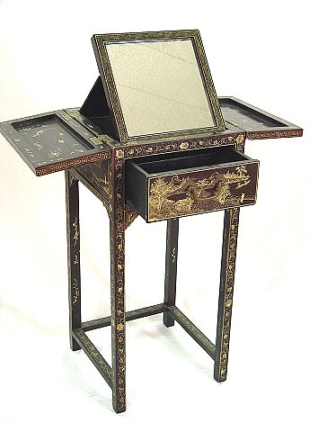 EARLY 20TH C CHINOISERIE or JAPANNED DRESSING STAND: Gold on black lacquer stand with hidden self store easel back mirror. Please call for condition. 32'' x 14 1/2'' x 14 1/2''.