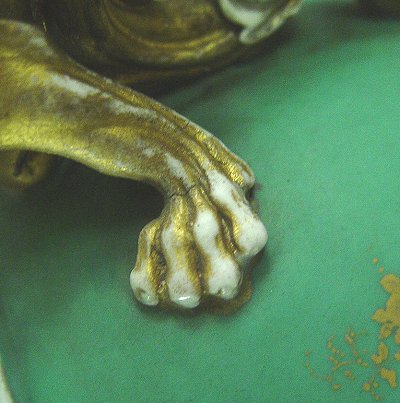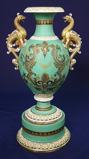 HIGH QUALITY 19TH C PORCELAIN VASE WITH FULL BODY DRAGON HANDLES: No makers hallmarks. Two part construction. Gilt decorated with wear to the gold. The dragons are 9''h., the vase is 22''h.