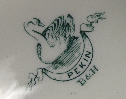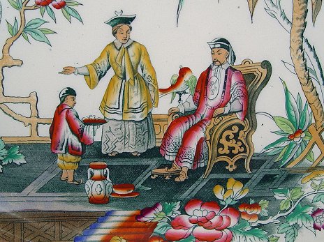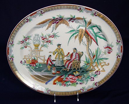 STAFFORDSHIRE TRANSFER WARE PLATTER IN THE ''PEKIN'' PATTERN: Polychrome with predominate blue. 18''l. x 14'' oval. B & H.