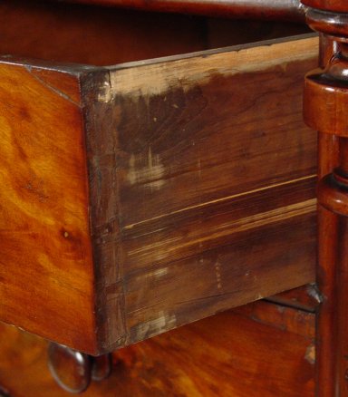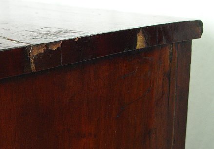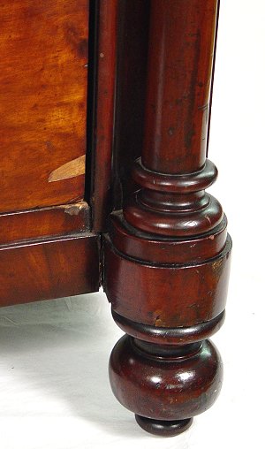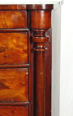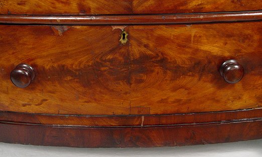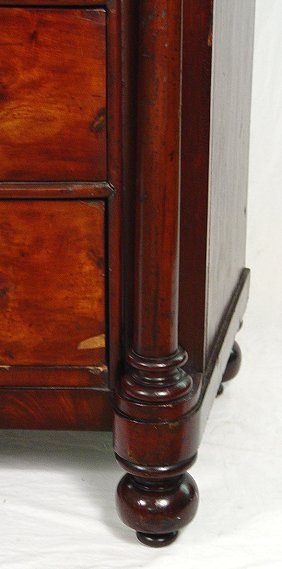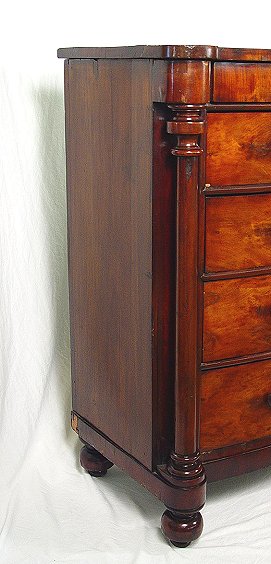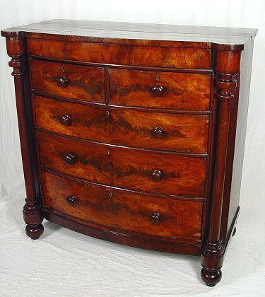 GRAND 19TH C SWELL FRONT MAHOGANY CHEST: Cookie cut corners over full column stiles, bun feet, 2 drawers over 4 with hidden upper drawer, 53''h, 52''w, 24''deep.