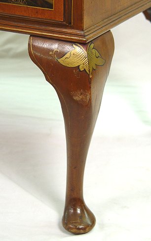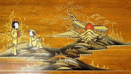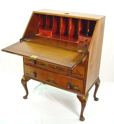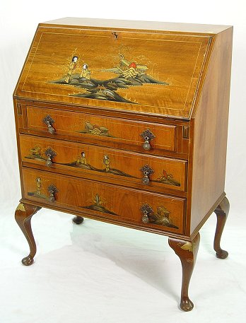 ENGLISH CHINOISERIE FALL FRONT DESK: Bears the nameplate ''North Hampton Cabinet Co. London''. Hand painted Chinoiserie decoration. Desk top over three drawers with exceptionally nice heavy pulls. 41''h. x 30'' x 18''. Est. $500/700**