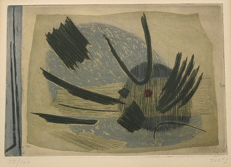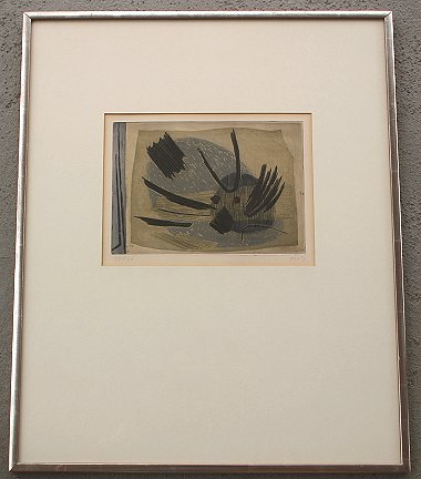 GOETZ, Henri Bernard, (French, 1909-1989): Abstract composition, Etching and Aquatint, sight size 7 1/2 x 10'', pencil signed lower right, numbered 39 of 100 lower left, encased in vintage fine silver gilt moderne frame, 22 1/2'' x 28 1/2. Condition - Some minor browning around the edges.