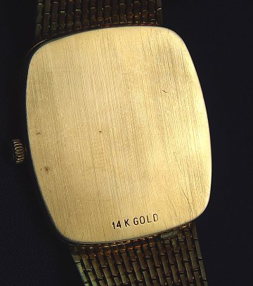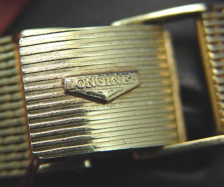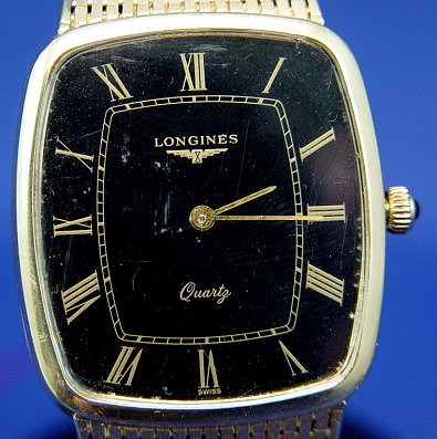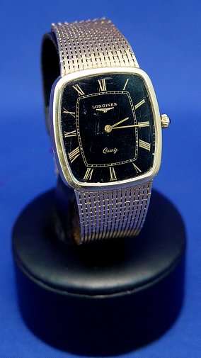 GENTLEMAN'S LONGINES 14K QUARTZ WRIST WATCH: Curved rectangular watch with black dial, gold hands and Roman numerals, attached tapered mesh bracelet, approx. 8''l. Quartz works marked Longines Swiss 54679191 L960.2 5 Jewels Unadjusted. Yellow gold case marked 14k Longines FI 3039-960 Italy, band ends in Longines clasp marked 14k Italy. Slight scratching to crystal, currently keeping time.