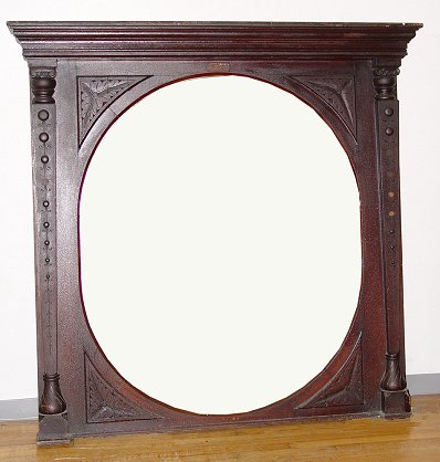 LARGE VICTORIAN OAK SALOON BACK BAR MIRROR: The brass plate reads. ''R Rothchilde Sons & Co. Saloon Fixtures Billiard Tables''. Round beveled mirror, oak frame with an alligatored finish. Some of the bulls eyes are gone from the frame. Approx. 70'' x 65''overall, the glass is 49'' round.