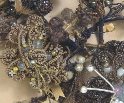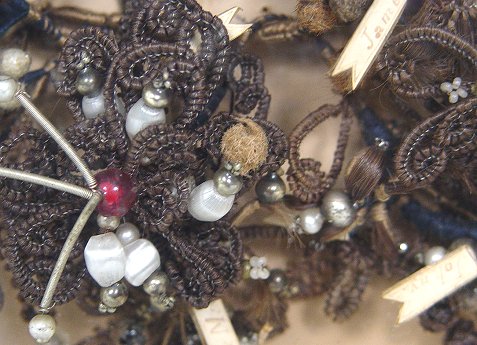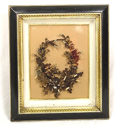 VICTORIAN HAIR WREATH: Encased in a deep dish period frame. An unusual feature is the paper name banners woven in with the hair, each with a loved ones name. Also silver colored glass beads are intertwined. 21'' x 18 1/4'' x 4'' deep. The wreath is approx. 10'' dia.