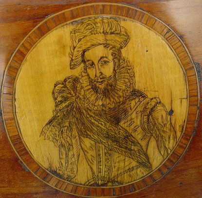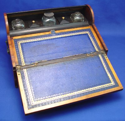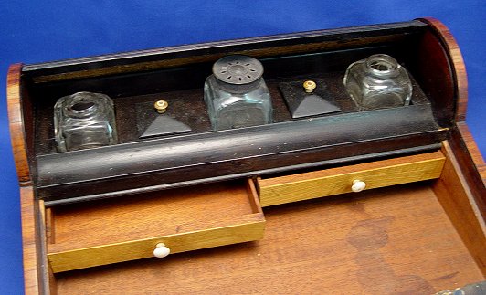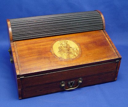 19th C TAMBOUR LAP DESK WITH INK BOTTLES: Upon opening the full length drawer the tambour cover opens to expose 3 ink bottle and covered stamp wells. Banded box and drawers featuring inlaid medallion with etched portrait. Lift top for blue leather covered writing surface and more storage with drawers. Please call for condition. 7 1/2''h. x 13 3/4'' x 10 1/4''.