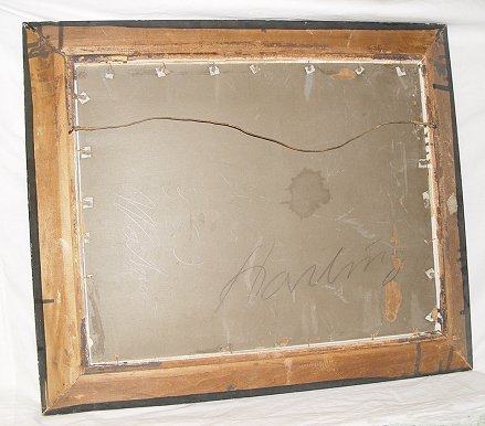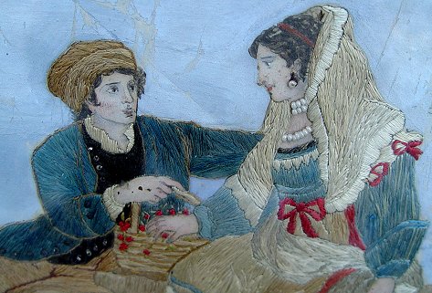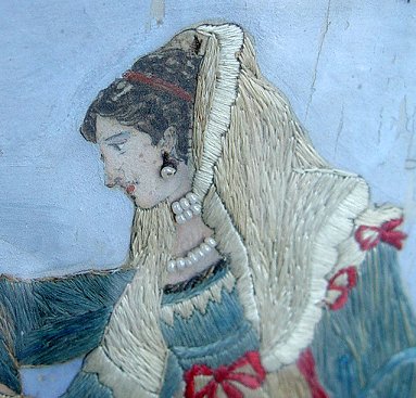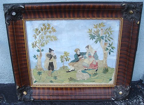 EMBROIDERED PANEL, SILK ON SILK: Hand embroidered scene on silk. The background and facial features are hand painted on what we believe to be silk. Note the actual beads on the woman. Framed under glass in period grain painted frame, 22'' x 26''. Image is 15'' x 19''.