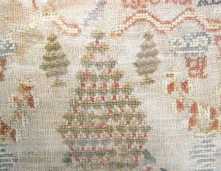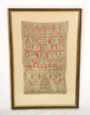 19TH C HAND SEWN SAMPLER: Alphabet alternating in red and green. Bottom section has trees and animals. The section that probably had the name and date is worn and illegible. Much later framed under glass 22 1/2'' x 15'' overall, the sampler is 16'' x 10''.