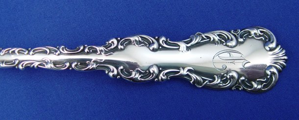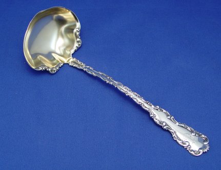 WHITING STERLING SOUP LADLE ''LOUIS XV'': Gold wash bowl, approx. 10 3/4'', monogrammed D, slight dent to front of bowl.