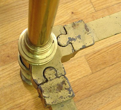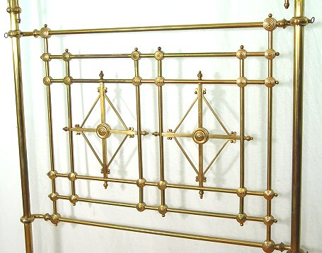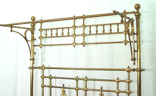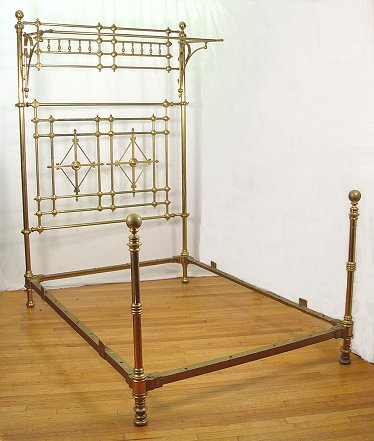 ORNATE BRASS BED WITH HALF CANOPY: The headboard is 8'6'' high. The footboard consists of two posts with ball finials, 3'5''h. Full size with iron rails.