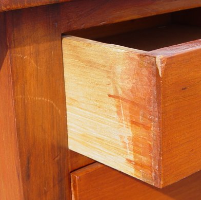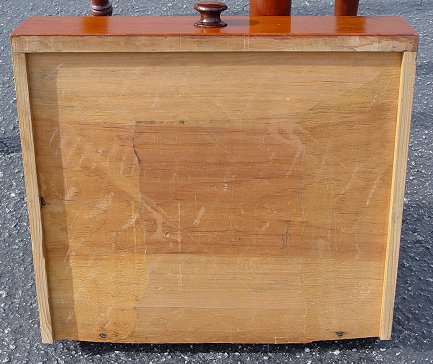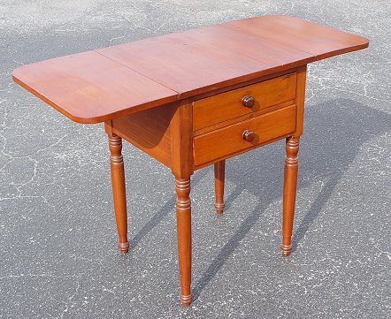 19TH C CHERRY TWO DRAWER WORK STAND: Drop-leaf work table, two drawers, turned legs. 27 1/2''h. x 17 3/4'', 40'' wide when leaves are extended.