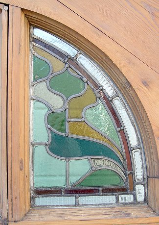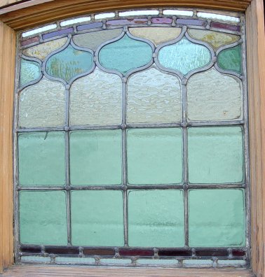 ARCHITECTURAL ''SMOKE ROOM'' STAINED AND ETCHED GLASS WINDOW: Framed in original wood frame, believed to be salvaged from a restaurant or speak easy. An arched of leaded, stained glass over two panels of frosted glass etched in a scroll design and Smoke Room.Approx. 76''h. x 52''. The glass is 48 1/2'' x 20 1/2''.
