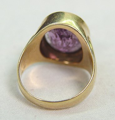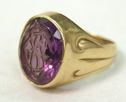 GOLD AND AMETHYST SIGNET RING: Lovely antique ring of 14k (assayed) yellow gold, impressed scroll design to shoulders, set with oval amethyst featuring faceted edges and bottom with center in-cut monogram of GSC, size 6 3/4.