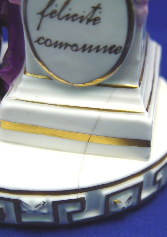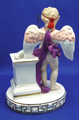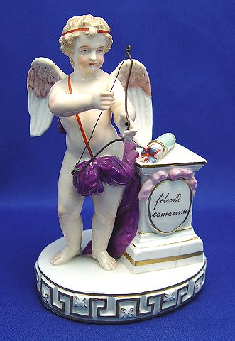 SCHIERHOLZ GERMAN PORCELAIN CUPID FIGURE WITH WIRE BOW: Ca. 1880- 1906, 8''h. Please note hairline.