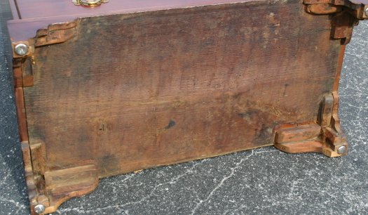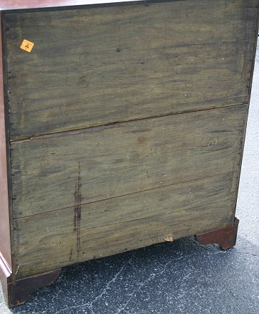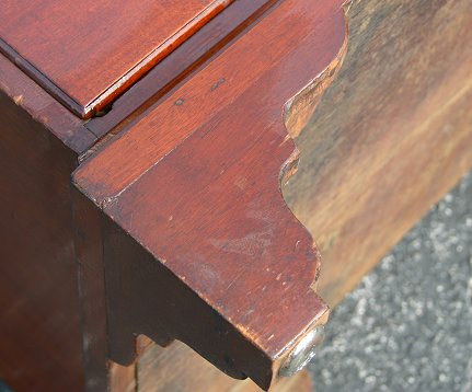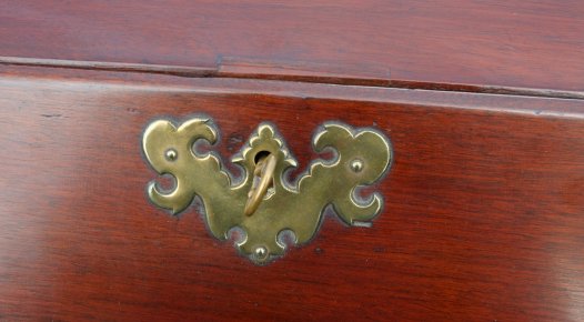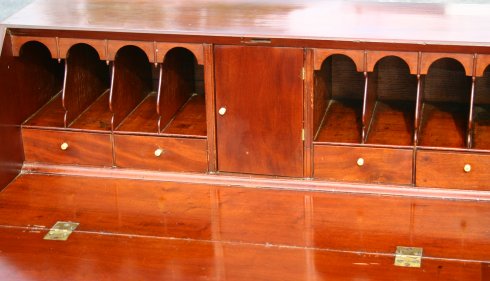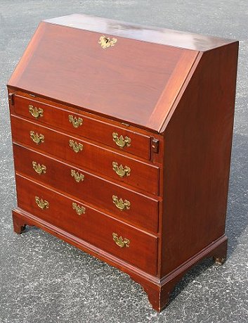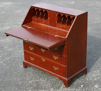 PERIOD CHIPPENDALE SLANT FRONT DESK: Flat top bureau desk with front that falls forward, supported by pull-out slides. Interior has 8 open pigeonholes with arched top, one pigeonhole covered with a door. Straight front of four graduated drawers. Key included. Dovetail and square head nails construction. Each of the slides are lacking the knobs. Later hardware. 40''h. x 35 1/2'' x 18 12/''.