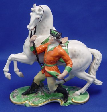 FINE NYMPHENBURG PORCELAIN FIGURE OF HORSE AND HUNTER: Dapple gray horse, gentleman hunter at his side. 8''h. x 8''l. No chips or cracks.