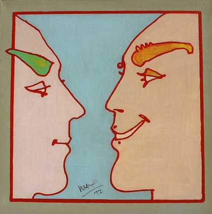 MAX, Peter, (American, 1937-): ''Double Profile'', Acrylic/Canvas, 24'' x 24'', signed bottom margin, dated '72, unframed. Condition - Professional restorations to tears in center of the piece visible by black light only, reinforced back. Est. $2000/4000**